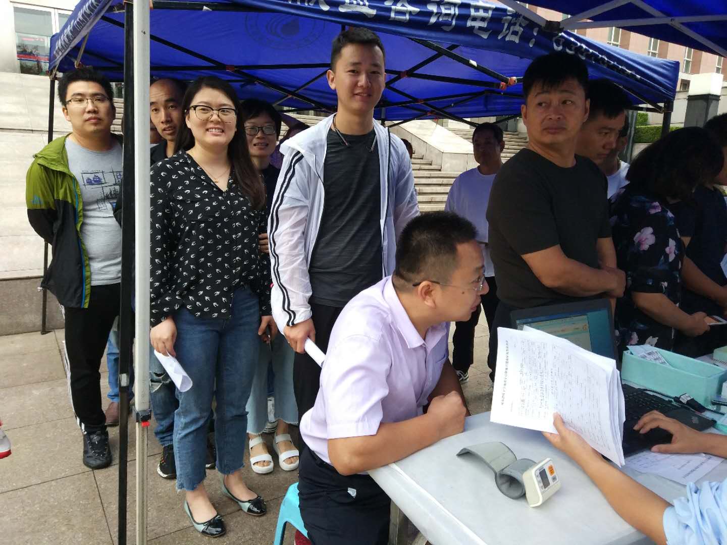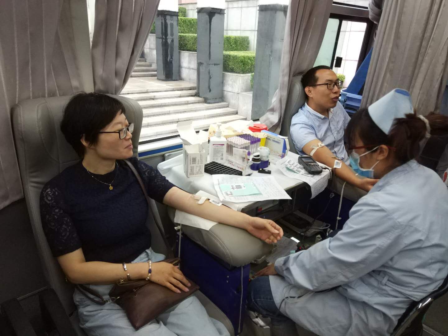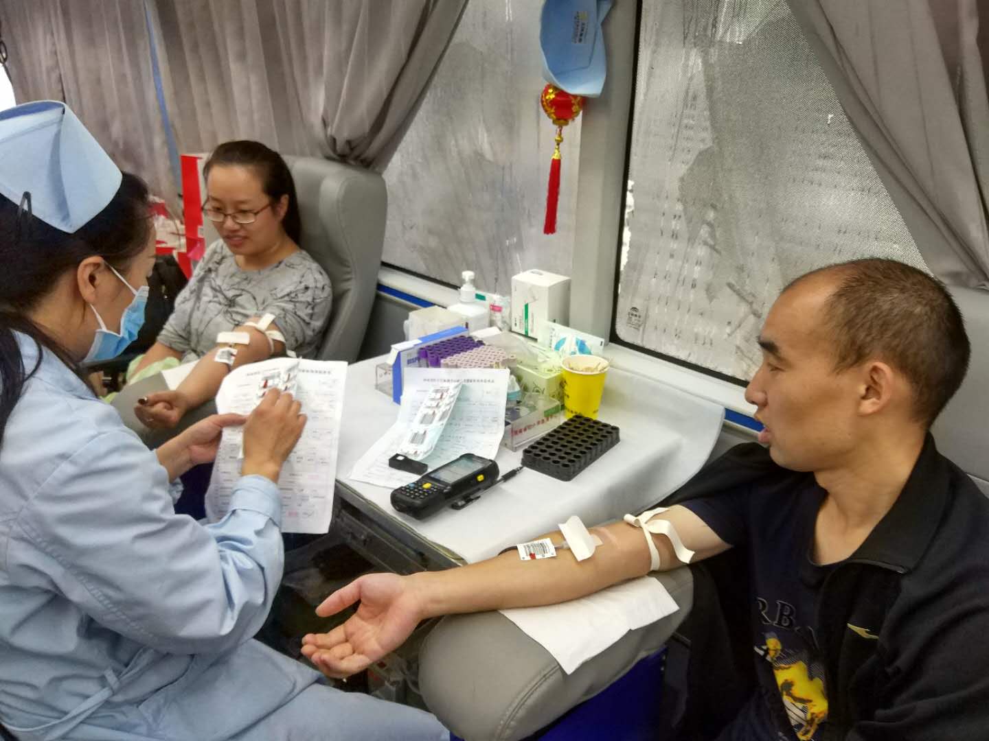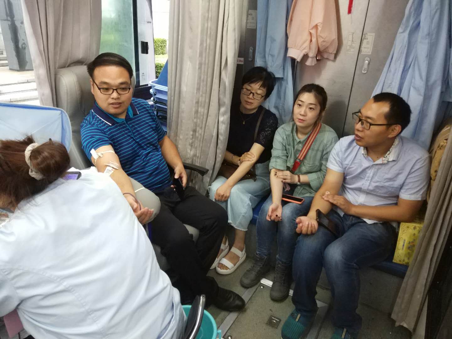 9月11日早上,一夜大風(fēng)過后,氣溫驟降,天空還下起了綿綿秋雨。在這樣惡劣的天氣環(huán)境下,書店的自愿獻血者依然按時來到出版集團公司大樓下的獻血活動點報到,主動參與到出版集團系統(tǒng)的集體獻血活動中。完成填表登記、采血化驗等準(zhǔn)備工作后,身體檢查合格的書店獻血者爭先恐后紛紛卷起衣袖,捐獻出自己的一份熱血。大家表示,能盡自己的微薄之力,無償獻血,為生命接力,是一次非常有意義的愛心活動。