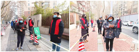 發(fā)行集團(tuán)志愿者不畏寒冷,按照要求提前趕到采樣點(diǎn),做好服務(wù)準(zhǔn)備工作。采樣期間,志愿者們根據(jù)工作分工,有的負(fù)責(zé)引導(dǎo)市民、維護(hù)現(xiàn)場秩序,提醒大家保持“一米線”距離,有序檢測,同時解答群眾詢問;有的志愿者專門負(fù)責(zé)把守等候區(qū),將排隊人員10人歸為一組,有序前行進(jìn)行掃碼確認(rèn),到達(dá)核酸集采處完成采樣。中午時分,志愿者輪流就地用餐,工作不曾停歇,忠誠值守完成當(dāng)天工作任務(wù)。