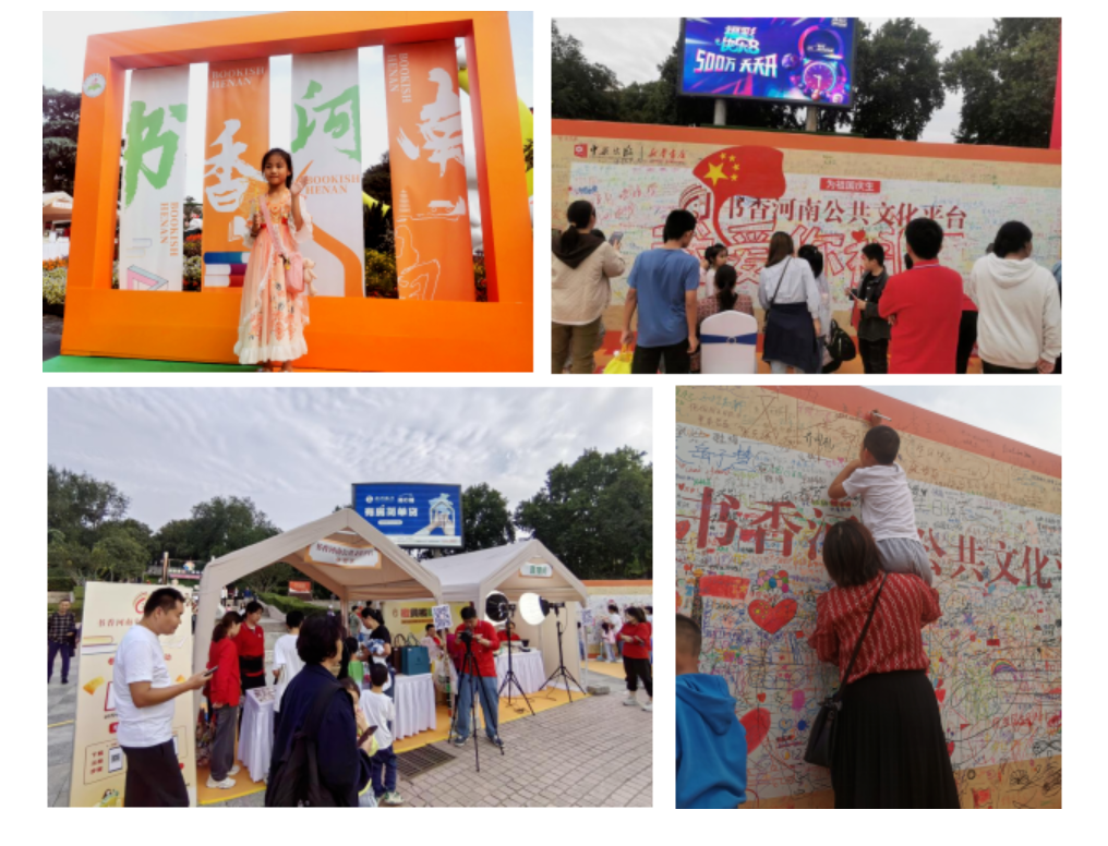 在活動(dòng)主會(huì)場(chǎng)鄭州市紫荊山公園,公益捐贈(zèng)、圖書(shū)交換、非遺文創(chuàng)、愛(ài)國(guó)彈幕、詩(shī)詞打卡、藏書(shū)票集章等互動(dòng)體驗(yàn)活動(dòng)打卡超1萬(wàn)人次,現(xiàn)場(chǎng)游覽書(shū)展7.3萬(wàn)人次,線上平臺(tái)瀏覽互動(dòng)超2000萬(wàn)人次;顒(dòng)中,書(shū)香河南公共文化平臺(tái)得到有效推廣,新增用戶12156人,總用戶量7.18萬(wàn),瀏覽量84萬(wàn)次。
