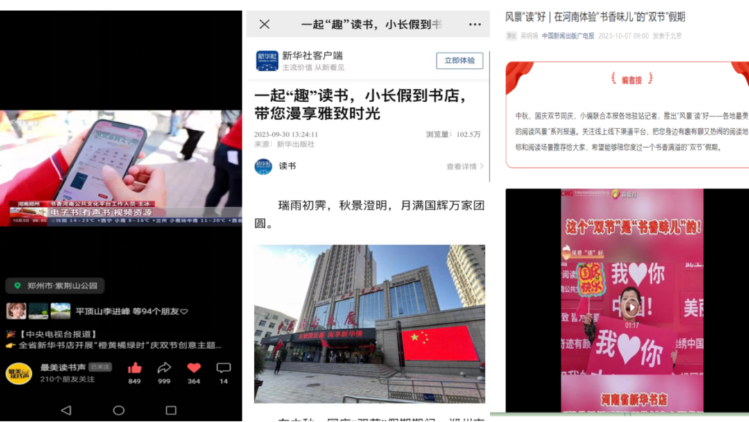 活動(dòng)期間,各地新華書(shū)店協(xié)同發(fā)力,通過(guò)體驗(yàn)式、沉浸式、互動(dòng)式的文化表達(dá)形式,將線上線下充分融合,吸引眾多媒體爭(zhēng)相報(bào)道。9月30日,新華社客戶端以“一起‘趣’讀書(shū),小長(zhǎng)假到書(shū)店帶您漫享雅致時(shí)光”為題進(jìn)行報(bào)道;10月2日,#國(guó)慶的河南是書(shū)香味兒的#等活動(dòng)相關(guān)話題登上微博熱搜,閱讀量突破240萬(wàn)次;10月3日,中央電視臺(tái)新聞?lì)l道對(duì)整體活動(dòng)進(jìn)行重點(diǎn)報(bào)道。此外,學(xué)習(xí)強(qiáng)國(guó)、中國(guó)新聞出版廣電報(bào)、河南日?qǐng)?bào)、河南電視臺(tái)、文旅中國(guó)、頂端新聞、今日頭條等權(quán)威媒體平臺(tái)共同聚焦報(bào)道,線上話題瀏覽量達(dá)到707.3萬(wàn)次,全平臺(tái)總瀏覽量超2000萬(wàn)次,有力實(shí)現(xiàn)了書(shū)香河南全民閱讀品牌的破圈傳播。