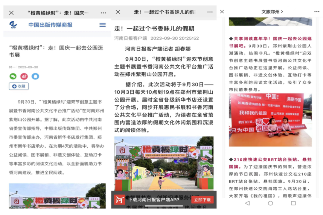 在剛剛結(jié)束的“雙節(jié)”8天小長(zhǎng)假中,由省委宣傳部指導(dǎo),中原出版?zhèn)髅郊瘓F(tuán)主辦,河南省新華書(shū)店發(fā)行集團(tuán)、全省各級(jí)新華書(shū)店聯(lián)動(dòng)承辦的“橙黃橘綠時(shí)”迎雙節(jié)創(chuàng)意主題書(shū)展暨書(shū)香河南公共文化平臺(tái)推廣活動(dòng),在全省市、縣(區(qū))文化地標(biāo)處圓滿舉辦。528場(chǎng)次的惠民書(shū)展、創(chuàng)意閱讀、潮流文旅、誦經(jīng)典、拆盲盒、手工制作等繽紛活動(dòng),深受人民群眾喜愛(ài)。