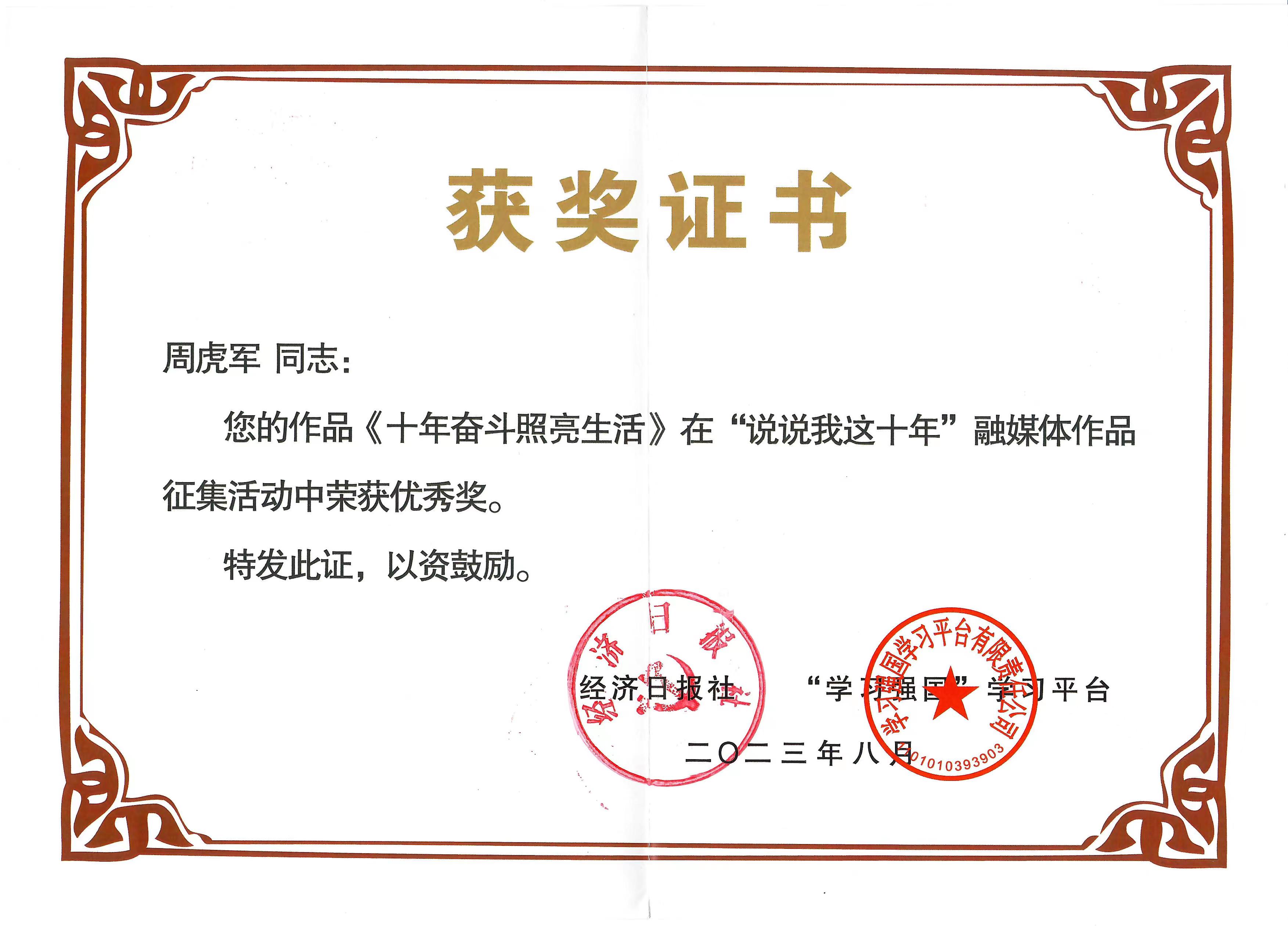 經(jīng)專業(yè)評選委員會嚴(yán)格評審,共有105篇投稿作品獲獎,其中“一等獎”2篇,“二等獎”5篇,“三等獎”10篇,“優(yōu)秀獎”88篇。鞏義市店員工周虎軍的作品《十年奮斗 照亮生活》榮獲“優(yōu)秀獎”。