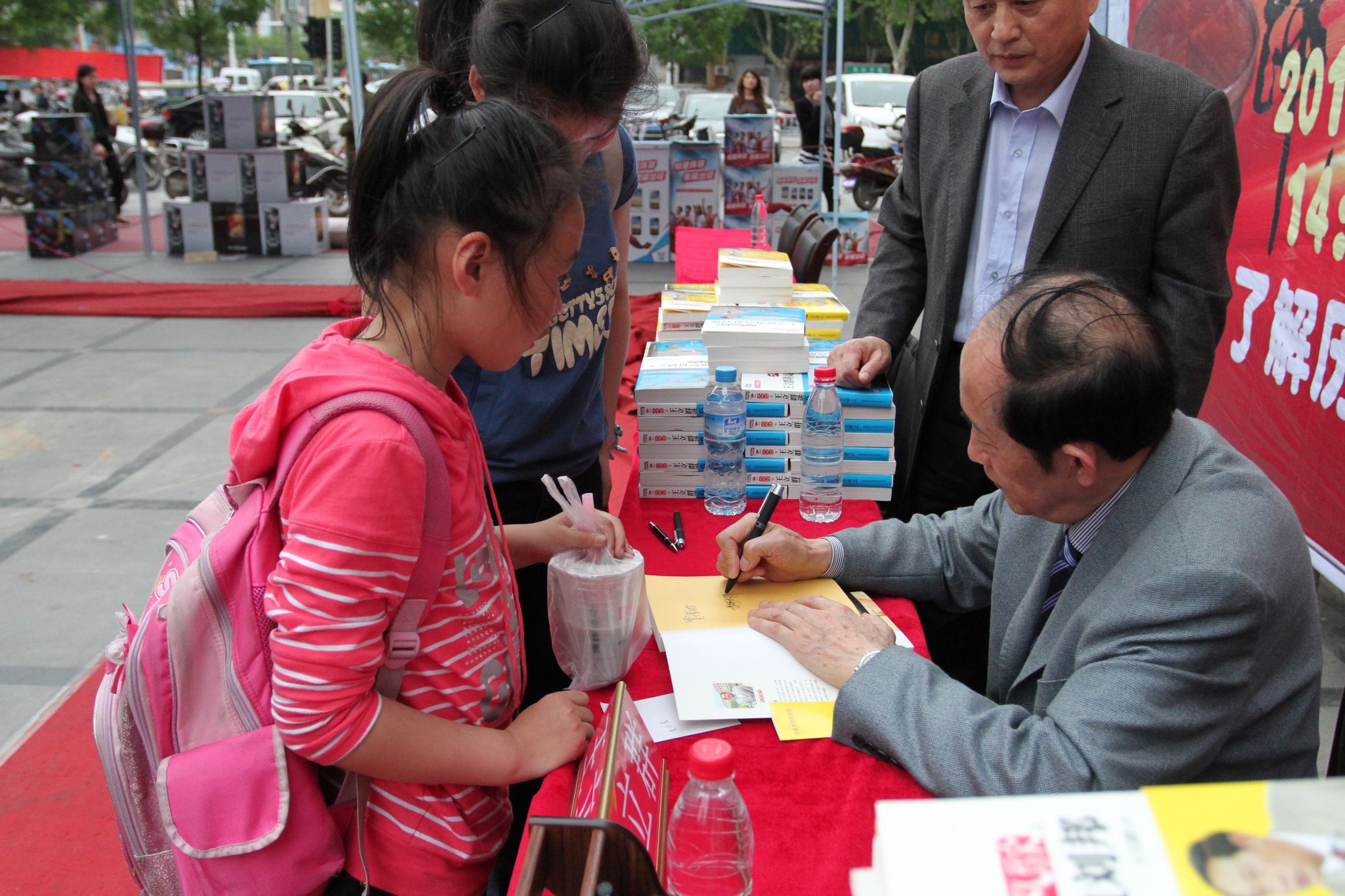 簽售過程中,王立群教授一直耐心與讀者交流,并詳細詢問讀者的姓名,仔細的簽在書的扉頁,助手遞到他手上的水都沒顧上喝一口。炎熱的天氣,擋不住讀者的熱情,有些讀者手中少則兩三套書,多則十幾套,他們表示購書簽名是為了送給親戚朋友。“送帶簽名的書不貴,有保存價值、有品位。”一位讀者對記者說。有一位老者是王立群教授的忠實粉絲,他的所有作品全部都有,并且都拿到了現(xiàn)場簽名,老者激動地說:“有幸拿到王立群教授簽過名字的書,太高興了”。原計劃兩個小時的簽售活動,因為讀者太多,又延長了半個小時的時間,整個簽售過程共為讀者簽售三百多套圖書。
