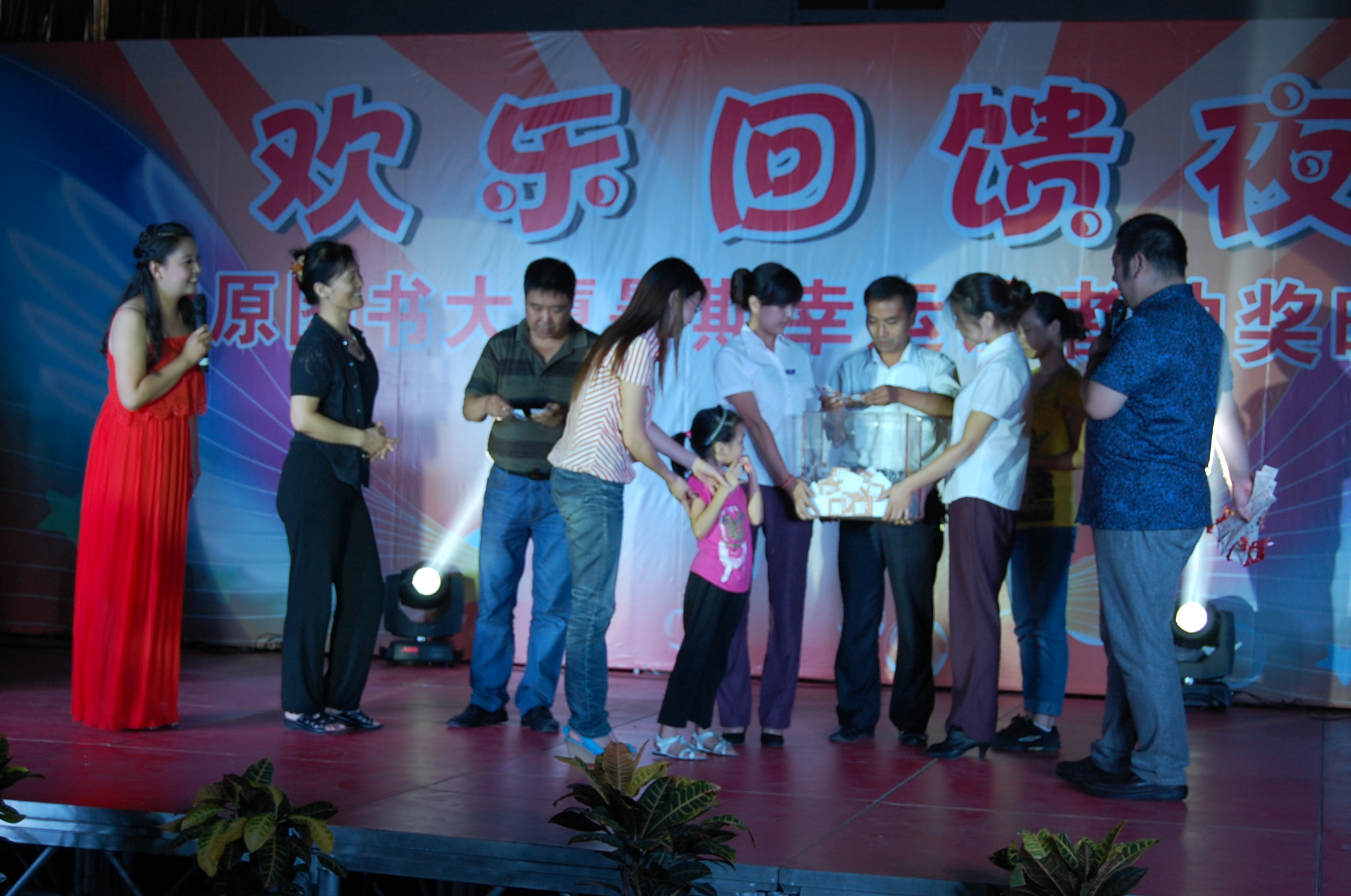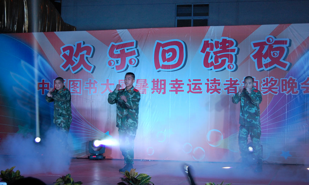 晚上,發(fā)行集團(tuán)員工同軍民共建合作單位武警鄭州支隊(duì)的戰(zhàn)士們一起為讀者奉獻(xiàn)出一臺(tái)富有激情的精彩晚會(huì)。街舞、獨(dú)唱、傣族舞、軍民對(duì)唱等一個(gè)個(gè)節(jié)目美不勝收,最后,武警戰(zhàn)士表演的團(tuán)體操擒拿格斗和發(fā)行集團(tuán)精心編排的合唱節(jié)目《紅旗頌》、《青春舞曲》、《愛(ài)我中華》等獲得現(xiàn)場(chǎng)觀眾最熱烈的掌聲,將整場(chǎng)晚會(huì)推向高潮,完美展現(xiàn)了軍民一家親的深厚情誼和發(fā)行集團(tuán)職工絢爛多姿的亮麗風(fēng)采。為回饋廣大讀者,中原圖書(shū)大廈推出了為期兩個(gè)月的《快樂(lè)暑期,幸運(yùn)連軸轉(zhuǎn)》抽獎(jiǎng)活動(dòng),本次晚會(huì)在文藝表演過(guò)程中穿插抽獎(jiǎng)內(nèi)容,出席晚會(huì)的領(lǐng)導(dǎo)和嘉賓,現(xiàn)場(chǎng)為獲獎(jiǎng)讀者頒發(fā)獎(jiǎng)品。