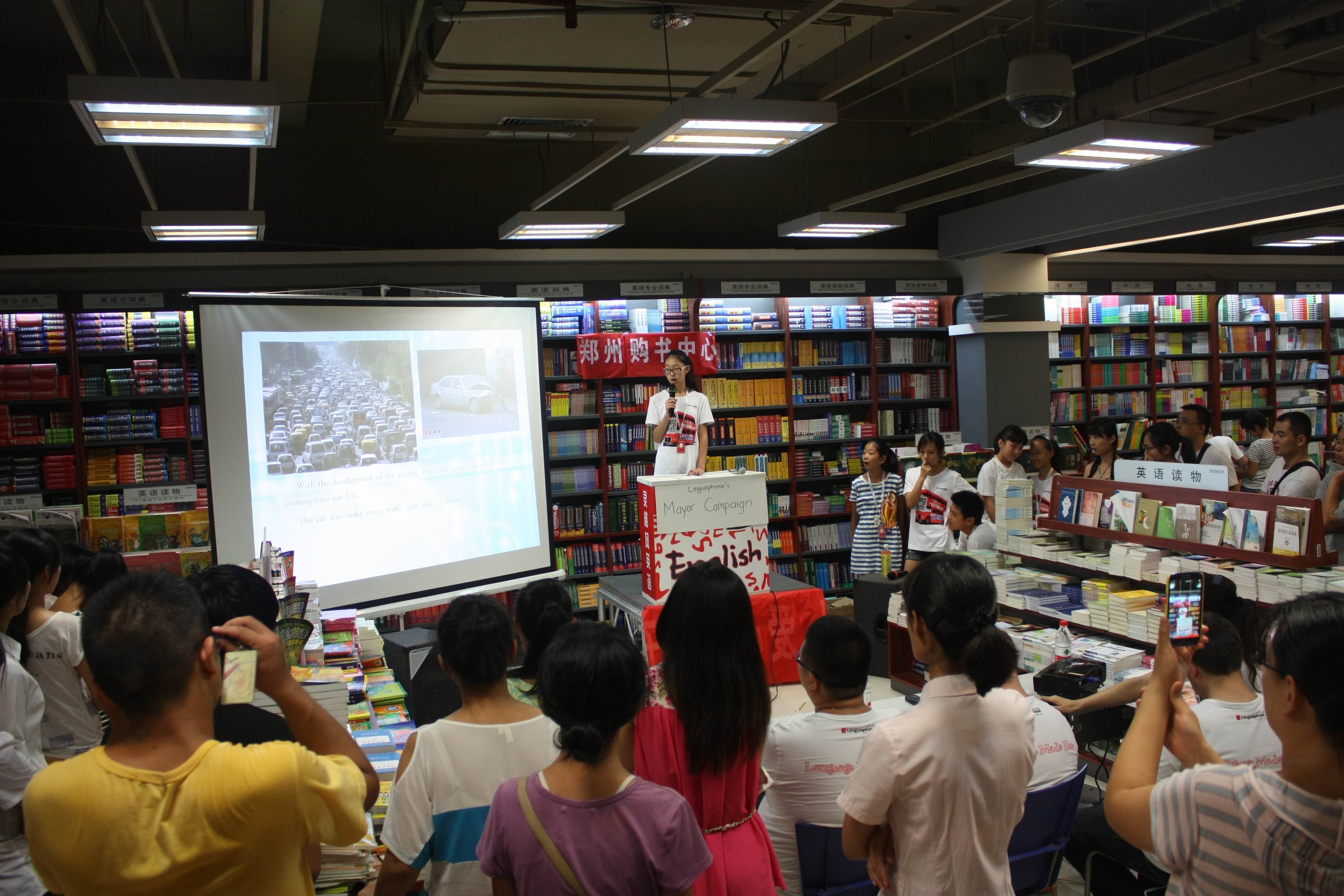 為回饋廣大外語(yǔ)愛(ài)好者的厚愛(ài),日前鄭州市店外語(yǔ)角活動(dòng)如期舉辦。本次活動(dòng)采用演講比賽的形式,規(guī)定以“市長(zhǎng)競(jìng)選”為主題,在鄭州市店購(gòu)書(shū)中心三樓外文書(shū)店內(nèi)開(kāi)辟場(chǎng)地,搭設(shè)演講臺(tái),配備投影儀及音響設(shè)備,并特別邀請(qǐng)了“靈格風(fēng)”外語(yǔ)培訓(xùn)機(jī)構(gòu)的專(zhuān)業(yè)外教擔(dān)任評(píng)委;顒(dòng)當(dāng)天,選手們精神飽滿,準(zhǔn)備充分,以流利的英語(yǔ)口語(yǔ)和抑揚(yáng)頓挫的語(yǔ)調(diào)博得現(xiàn)場(chǎng)陣陣掌聲,同時(shí)活動(dòng)也吸引了眾多讀者的圍觀和參與,大家紛紛踴躍地對(duì)參賽選手進(jìn)行互動(dòng)投票,最后該店工作人員對(duì)專(zhuān)家和大眾評(píng)審的結(jié)果進(jìn)行了匯總,現(xiàn)場(chǎng)公布了參賽選手的獲獎(jiǎng)名次,并為他們頒發(fā)了精心準(zhǔn)備的獎(jiǎng)品。