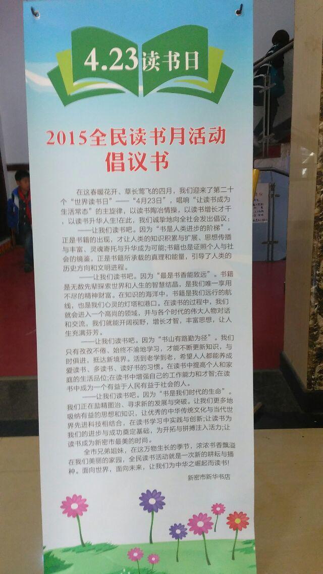 為更好營造書香社會,促進社會閱讀風尚的形成,提升民族文化素質,推進學習型城市建設,提高我店綜合收益,在4月23日世界讀書日來臨之際,新密市新華書店發(fā)出了2015年全民讀書月活動倡議書,提出了“美麗四月天,相約讀書日”閱讀主題,全力搞好宣傳,確;顒尤〉脤嵭В該店利用電子顯示屏、張貼海報、賣場布置等手段進行宣傳,營造氛圍,并積極組織開展流動售書活。