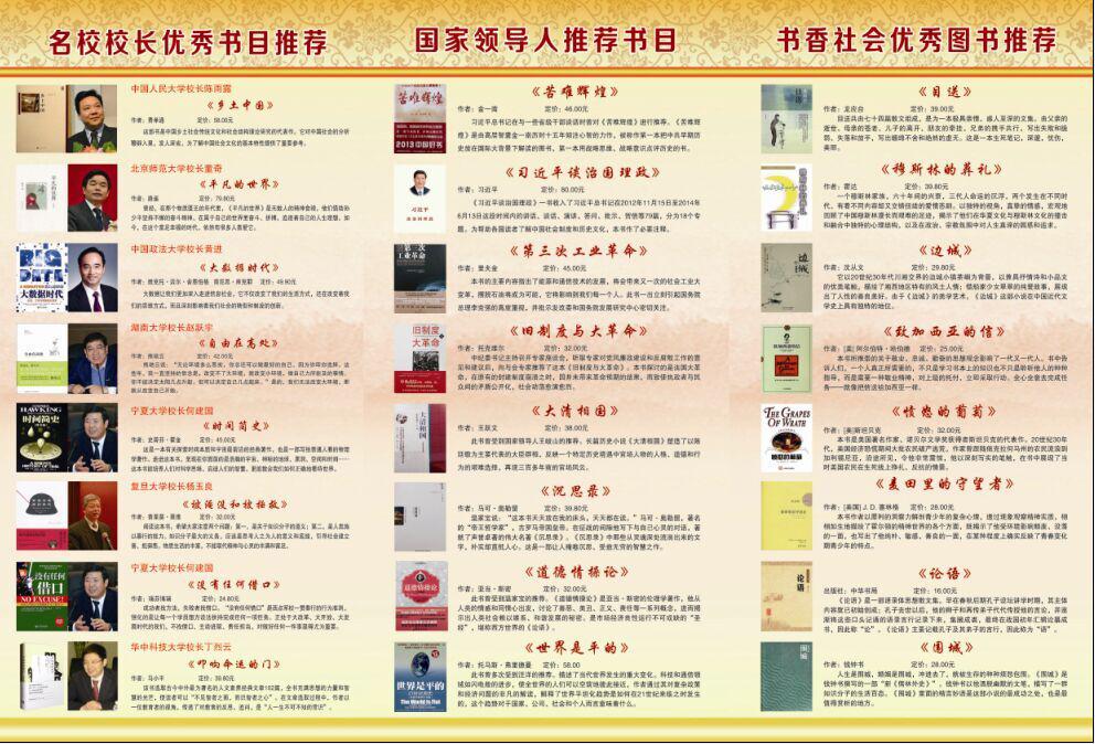 為進(jìn)一步提升服務(wù)社會(huì)、服務(wù)讀者的能力。延津縣店結(jié)合“黨和國(guó)家領(lǐng)導(dǎo)人推薦圖書”、“中紀(jì)委推薦圖書”、“知名大學(xué)校長(zhǎng)推薦書單”、“2014中國(guó)好書”,精心編印了“延津縣新華書店推薦書目宣傳征訂單”,并組織專職人員到各個(gè)黨政機(jī)關(guān)、企事業(yè)單位上門推銷。五月份實(shí)現(xiàn)流動(dòng)式銷售1394冊(cè),7.38萬(wàn)元。