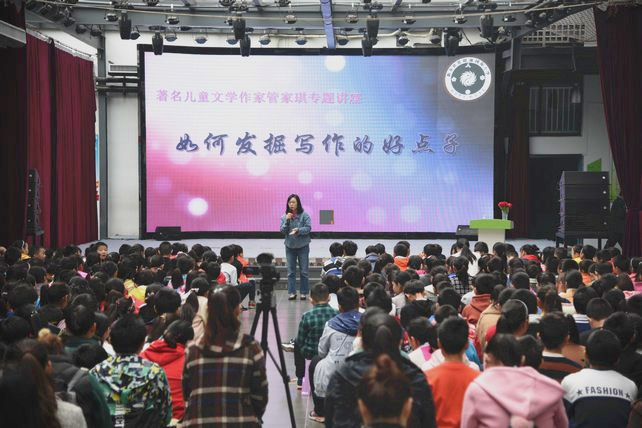在“名家進校園”活動中,管家琪老師每到一所學(xué)校,都以自己如何與寫作結(jié)緣為引,談到自己獲得寫作題材的方法,鼓勵學(xué)生們在日常中多記錄,做好筆記,尋找發(fā)現(xiàn)的眼睛,結(jié)合寫作經(jīng)歷和生活小故事,以通俗易懂、風趣幽默的語言和豐富的人生經(jīng)歷,和學(xué)生共同分享閱讀和寫作中的感悟,教學(xué)生發(fā)揮想象,感受寫作帶來的樂趣。精彩互動環(huán)節(jié)中,管家琪老師以游戲的方式和孩子們玩起來寫作游戲。針對大家寫作方面的迷茫與困惑、管家琪老師與現(xiàn)場孩子們進行真摯而親切的交流,解答孩子們的困惑;顒蝇F(xiàn)場氣氛活躍,活動的最后管家琪老師還建議孩子們,在日常生活中,多閱讀名著以及積極向上的作品,它可以開闊視野,拓展思維,F(xiàn)場觀眾或積極提問、踴躍發(fā)言,或認真聆聽、認真記錄,現(xiàn)場洋溢著開心閱讀氣氛。在每次講座結(jié)束后,管家琪老師還饒有興趣地為喜歡自己作品的小讀者簽名留念。